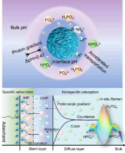 针对现有镧改性膨润土因镧分布异质性与静电排斥作用导致的磷酸盐界面传质受限及吸附选择性不足问题(尤其在低磷酸盐浓度(≤0.5 mg·L-1)及多阴离子共存条件下),本研究成功合成氨基功能化黏土材料NH2-La-Ben(Et),实现了磷酸盐的高效选择性吸附。该材料以乙醇预处理的膨润土为载体,通过接枝有机硅烷胺(APTES)并负载镧,实现磷酸盐吸附容量58.8 mg P·g-1与优异的分离常数(α)。在深度除磷过程中,质子化氨基通过与水分子的氢键作用在内亥姆霍兹平面(IHP)建立局部质子梯度(ΔpH=0.47),显著提升了静电势(Ψ=27.80 mV)、磷酸盐扩散系数(4.37×10-7 cm2·s-1)并缩短了PO43-积累距离(2.85 vs. 3.68 nm),最终实现了磷酸盐高效传质(动力学常数0.82 min-1)。NH2-La-Ben(Et)通过增强的镧负载和降低的腐殖质增强了内球络合占比(62.5%,BB-H1/BM-H1构型)及抑制LaPO4沉淀(37.5%),赋予了材料对竞争阴离子的高选择性。吸附柱实验(突破8000 BV)与技术经济分析(磷回收效益(65.76 USD/kg P)进一步验证了其工程应用潜力。本研究为设计和应用新型黏土基吸附钝化材料以治理水体富营养化提供了创新设计范式,解决了吸附剂高效性与选择性难以协同优化的关键挑战。同时,开发了一种基于原位拉曼光谱与静电势定量计算的新型表征方法,实现了吸附剂表面质子化过程的精准解析。